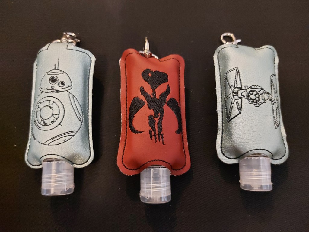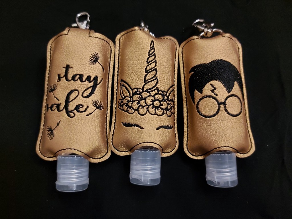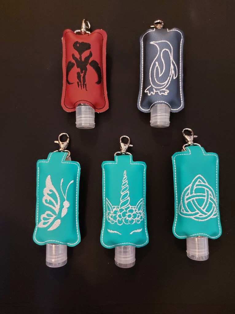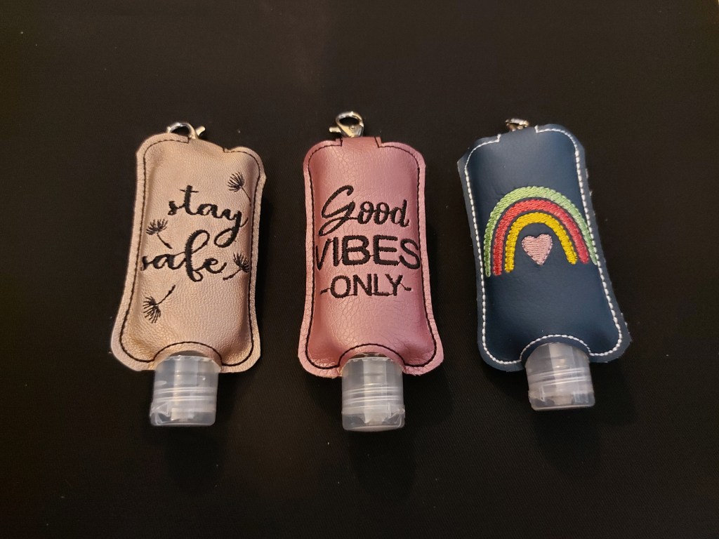 Praktisch sind auch diese kleinen Desinfektionsmitteltaschen – dank Karabiner kann man sie überall dranhängen und hat stets saubere Hände. Die Motive sind sehr vielfältig.
