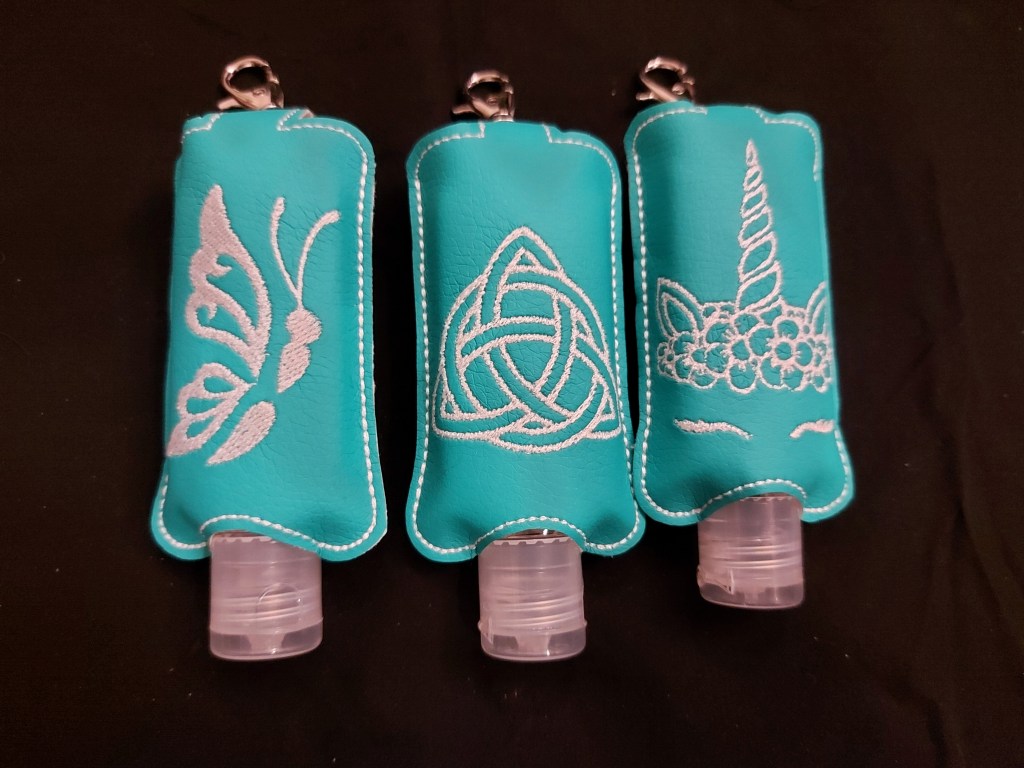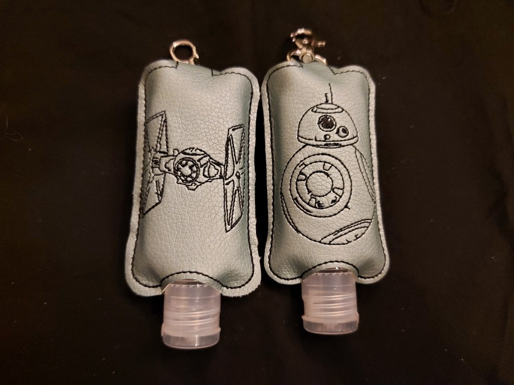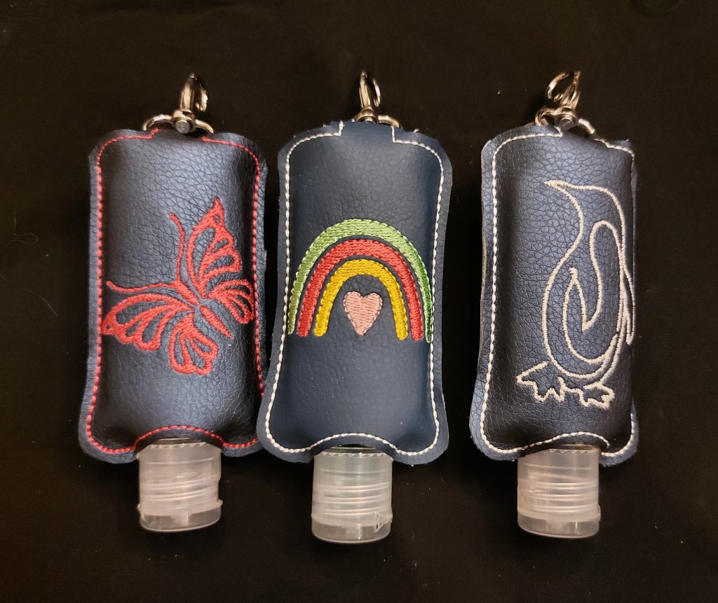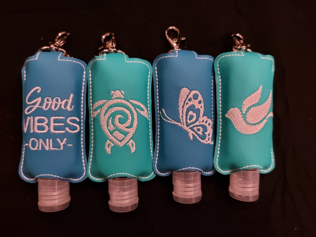 Praktisch sind auch diese kleinen Desinfektionsmitteltaschen – dank Karabiner kann man sie überall dranhängen und hat stets saubere Hände. Die Motive sind sehr vielfältig.